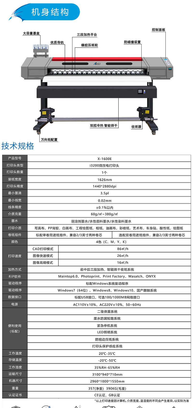 智能墨棧:自動清洗、吸墨、保濕功能,達到最佳的打樣效果,不易斷墨; 大容量墨盒:1.6升大容量墨盒,滿足長時間輸出供墨需求,提高工作效率; 安全保密:采用國產(chǎn)板卡電路,配備國產(chǎn)操作軟件,移除硬盤儲存,保障數(shù)據(jù)安全; 直流無刷電機:配備雙向無刷電機,高精度驅(qū)動線性解碼,精度更高,運行更穩(wěn)定; 智能羽化打?。邯殑?chuàng)二維智能羽化功能,有效解決打印中的pass道,提升打印品質(zhì)高度; 智能烘干系統(tǒng):打印與加熱同時進行,節(jié)約能源,實現(xiàn)多種墨水,即打即干,提高工作效率; 采用國際先進的Hiwin線性導軌系統(tǒng),使機器噪音低,運行平穩(wěn);全自動升降平臺和清洗系統(tǒng),節(jié)省時間精力,工作更高效;智能化設計,兼容多種打印軟件,支持Windows系統(tǒng)軟件直接輸出,使用更加得心應手。